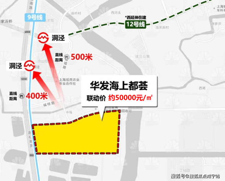 交通方面,该地块距离9号线洞泾站,直线距离约400米,距离在建地铁12号线西延伸段,直线距离约500米。地铁12号线西延伸段,是松江继9号线的第二条轨交地铁线,预计2027年年底通车。自驾可从嘉松南路、沈砖公路等主干道到达各处。