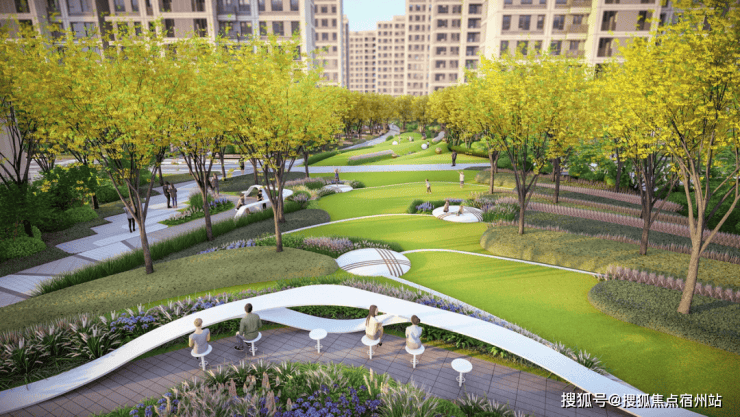 以公园+花园的双园社区、品质归家入口、特色阳光草坪、双会客系统、主题儿童乐园、健身系统这六大功能价值为主,并且融合由三条不同主题的林荫步道和三个圆形景观节点组成的“绿林项链”全区漫步系统,共同构成全区“6+1”森O₂家园系统。