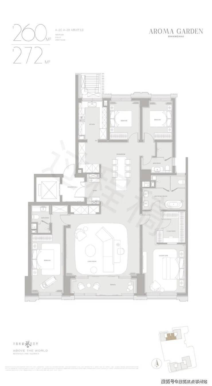 建面约260/272㎡,南向双套房,尤其主卧是豪华套房,带独立衣帽间,卫浴间含双台盆+淋浴+浴缸+马桶四件套。