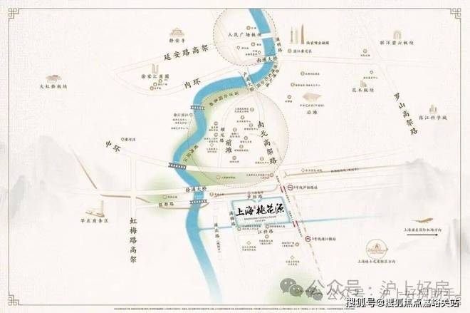 上海桃花源的择址,与传统市中心人民广场在南北中轴线上,由济阳路快速路、中环、外环以及各大隧桥快速连通市区,这是项目出则繁华的基础。