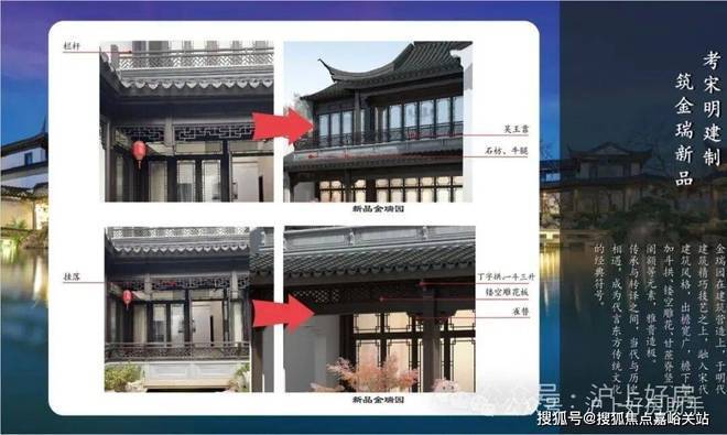 同时,建筑采用宋代宫殿,建筑出檐宽广,檐下增加斗拱、镂空雕花、甘蔗脊、阑额等元素,约2/3宅园设置入户连廊,为全国之最,雅贵造极。