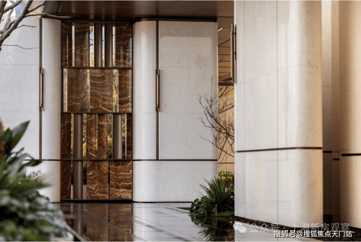 6、 社区含“奢材”量很高。 门庭延街的外立面,以精工定制弧形 米色石材 为主调,镶嵌典藏级 老虎玉大理石 ,点缀 古铜色现代海派艺术感 灯器,整体呈现出百年海派的贵雅气质。
