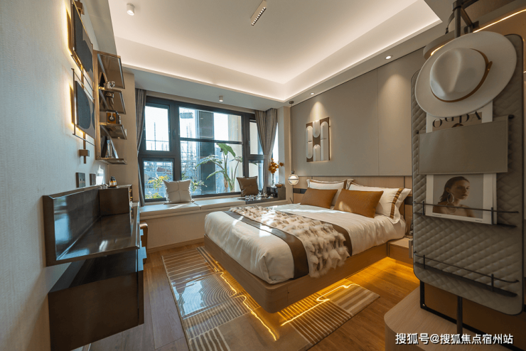 星空连廊的顶面采用香槟金铝板、墙面为爱马仕灰仿石砖,并镶嵌金属线条、就连地面都采用了夜里雪仿石砖