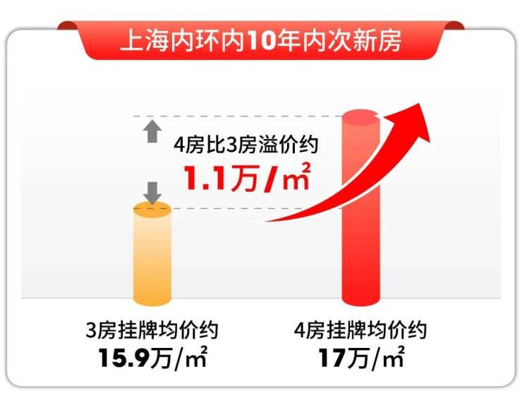 其二、珍稀必然面临高溢价,当前内环内次新3房挂牌均价约15.9万,4房则要17万,溢价1.1万。不得不承认,四房才是当前内环内的硬通货!