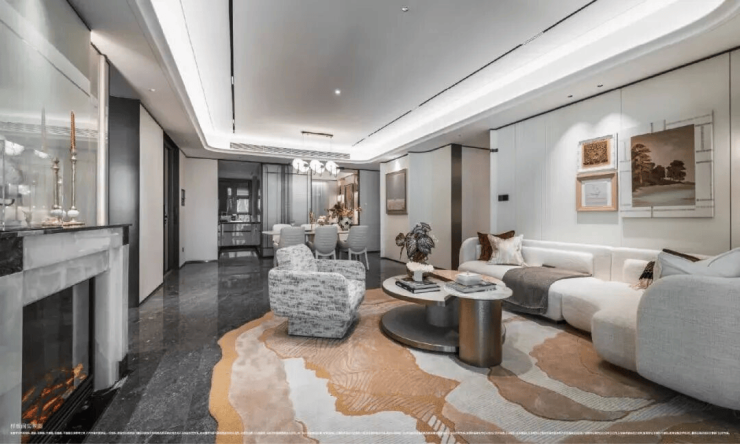 在豪宅的配置之外,精装细节亦追求极致:公共区域选用80×80cm的大理石通铺,以整面石材的厚重质感彰显空间格调,同时采用无缝拼接工艺,显著降低了日常清洁的难度。