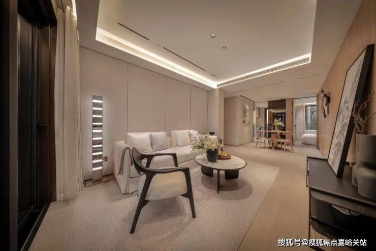 客厅无主灯、隐藏式的空调出风口、木饰面电视机背景墙、内嵌式的金属踢脚线,极简风审美呈现: