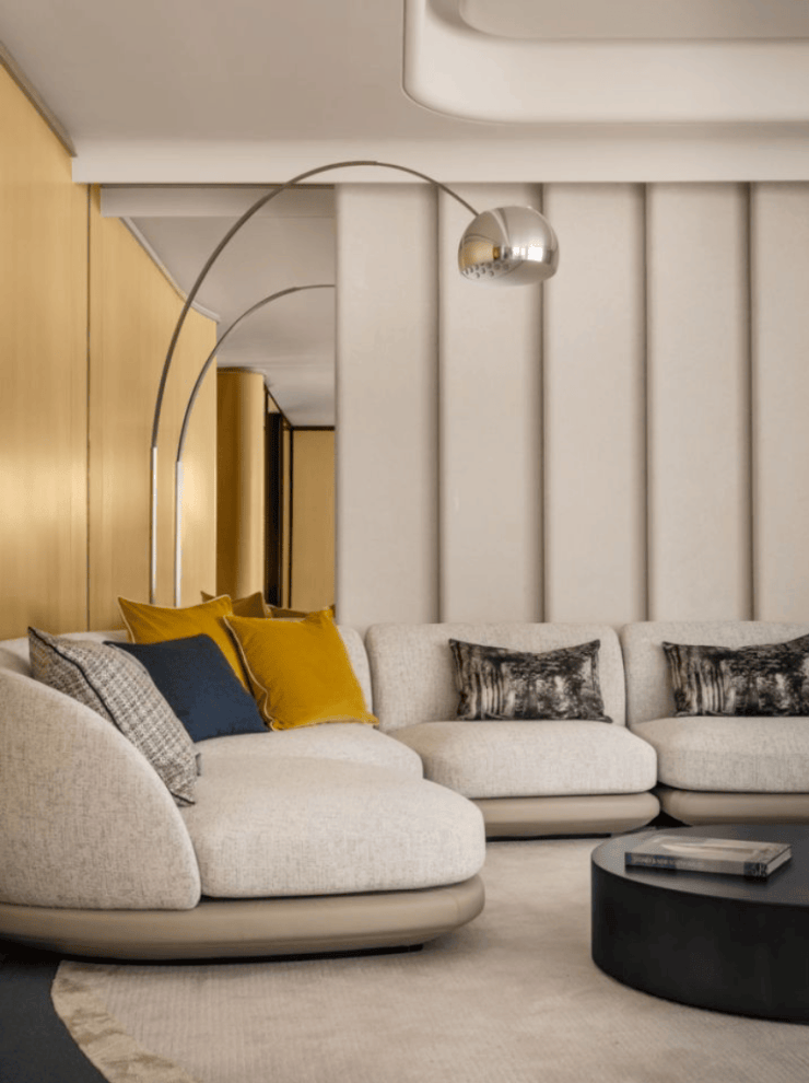 客厅空间采用大量造价昂贵的弧面设计,带来更有格调的审美价值: