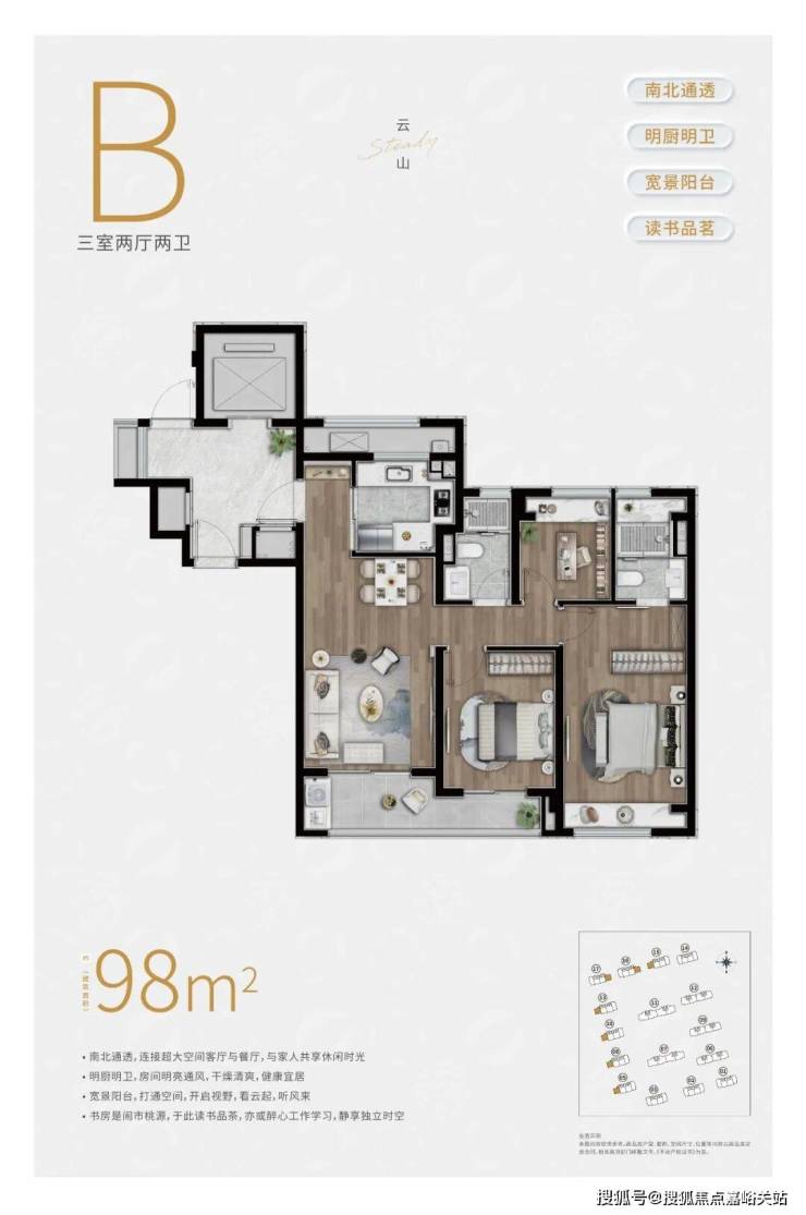 约98㎡3房2卫户型,三开间朝南,并且这贯穿客厅+次卧的超大阳台实在是惹眼,这个南向的视野延展度以及采光度相比同级别的户型来说,要更加出色。