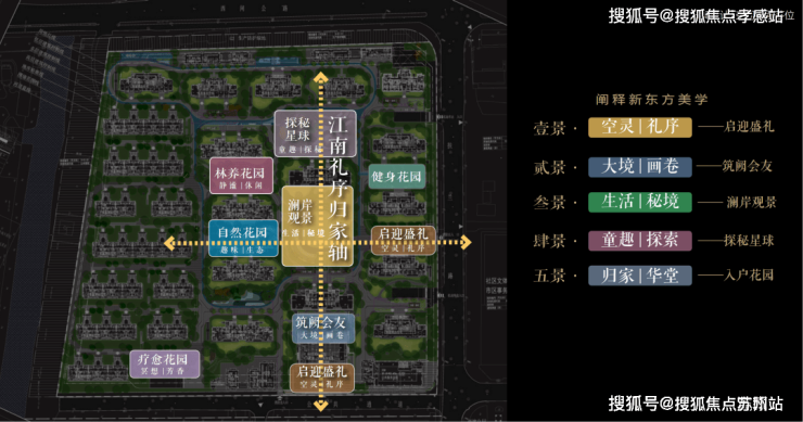 以江南人文精神为源点,打造两轴一环五进空间,江南礼序归家轴串联启迎盛礼、筑阙会友、归家华堂等5重礼制,尊崇归家;健康运动轴以24小时跑道为社区活力生活环,串联儿童乐园、长者康养、疗愈花园等10大生活场景,营造全龄全时的江南诗意生活