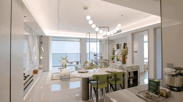 迈入客餐厅,气派方厅设计,衔接瞰景阳台足以摆得下承载八人的餐桌,彰显大家风范。