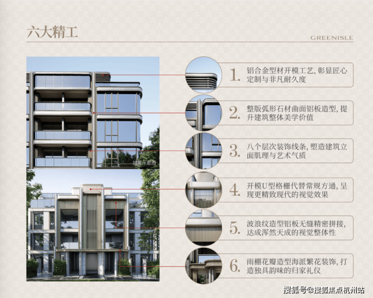 采用大面积玻璃、金属线条、威斯康白石材,将松江新城的住宅建筑美学拉入下一个LEVE,尤其是香槟色金属线条如剪裁合体的高级西装骨架,勾勒出建筑的精致轮廓。设计师更在立面体系中嵌入了防流挂小线条,使其略凸出于墙面,引导雨水沿线下落,有效避免对立面材料的污染。