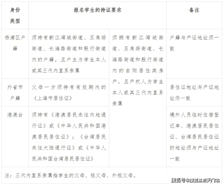 杨浦区户籍:须拥有新江湾城街道、五角场街道、长海路街道、殷行街道内的户籍,且户主为学生本人或三代内直系亲属+须拥有上述街道自购居住类房产,且产权人为学生本人或三代内直系亲属+居住证地址与房产地址须一致。