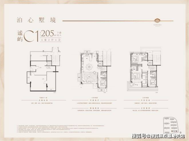 户型特点:绿城·逸庐预约热线☎:400-8080-420✅✅【已认证】下叠边套,南向面宽约9米,客餐厅同宽约5.8米,空间开阔。一楼设南向卧室,采光好且视野佳。二楼为三套房+主卧总统套房设计,主卫南向,可容纳浴缸和双台盆。地下室方正,附赠采光井,利用率高。