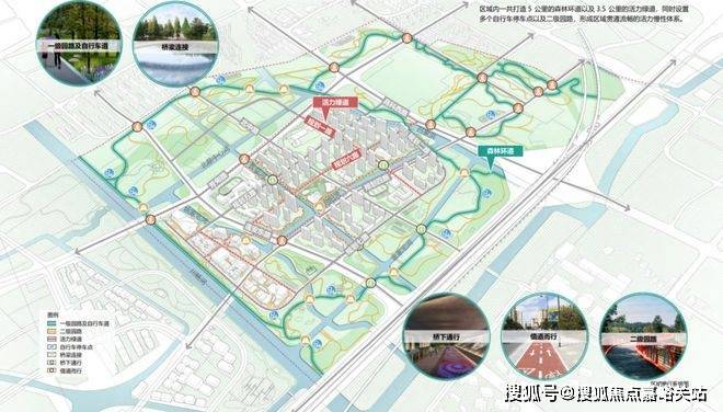5公里森林环道以及3.5公里活力绿道,部分街区通过桥梁进行衔接,联系被市政道路割裂的绿地,使绿地成为一个整体,车流量大的城市道路交叉处慢行系统桥下通过。