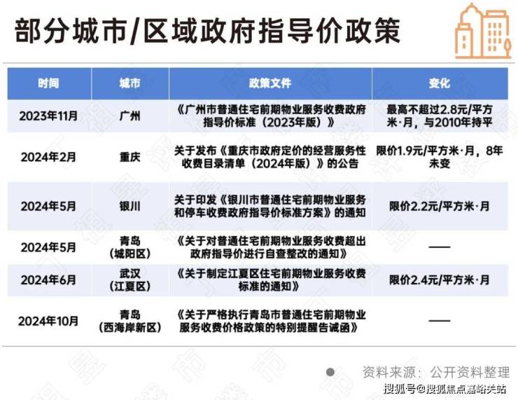 随后2024年5月,银川和青岛城阳区先后发布关于印发《银川市普通住宅前期物业服务和停车收费政府指导价标准方案》的通知及《关于对普通住宅前期物业服务收费超出政府指导价进行自查整改的通知》。