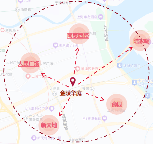 2公里内括淮海路、新天地、人民广场、外滩、陆家嘴等城市级CBD。