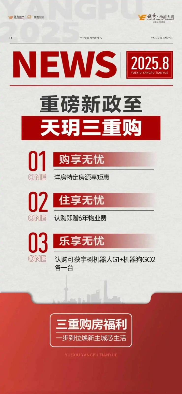 三重好礼:①洋房特定房源享钜惠、②认购即赠6年物业费、③认购可获宇树机器人G1+机器狗GO2各一台。