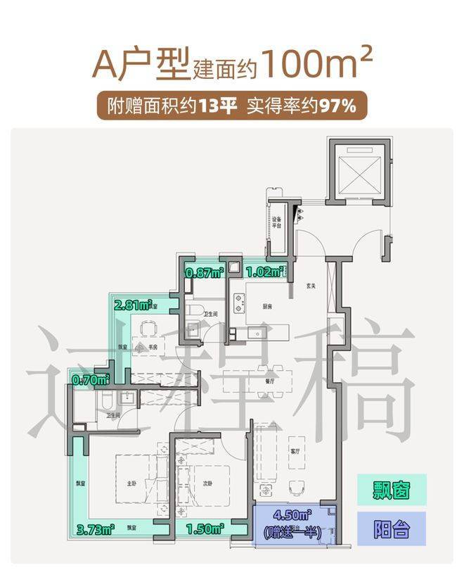 经专业测算,A户型全屋赠送面积高达13㎡,实得率约97%。