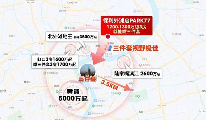 保利外滩启PARK77距离陆家嘴三件套直线距离约3.5公里。以三件套为圆心,环顾这3.5公里范围内的新盘,可以得出几个极具冲击力的结论: