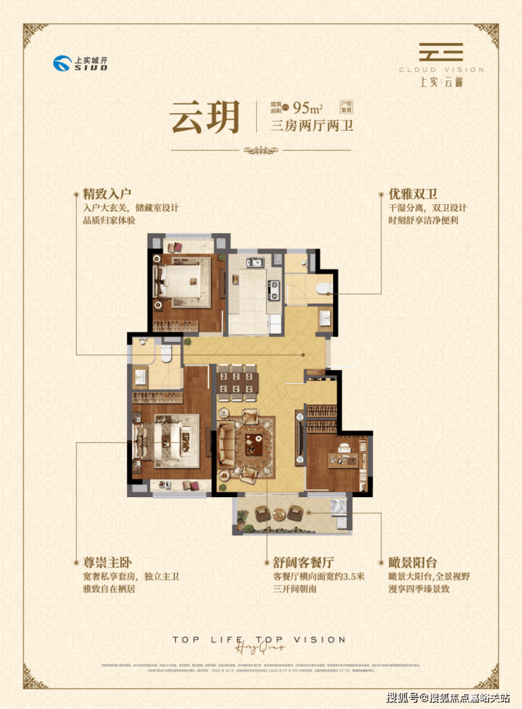 约95㎡三房两厅两卫,做到了三开间朝南+瞰景大阳台+主卧套房设计+南北通透+卫生间干湿分离,该户型得房率和空间利用率都非常高。