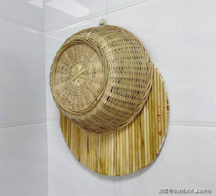 另一边的空白墙壁上安装挂钩,挂竹编篮子和饺子盘,也是同时起到晾干沥水和充分利用空间的双重用途。