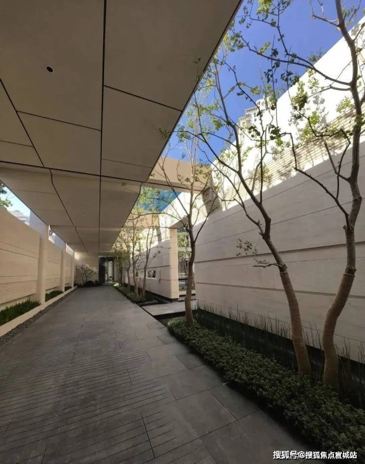 造景的用料也同样考究,大门景墙选用工艺复杂、用料扎实的沙漠风与白海棠石,风雨连廊选用了经过多轮艺术工艺抛光打磨形成的哑光荔枝面的沙漠风石。