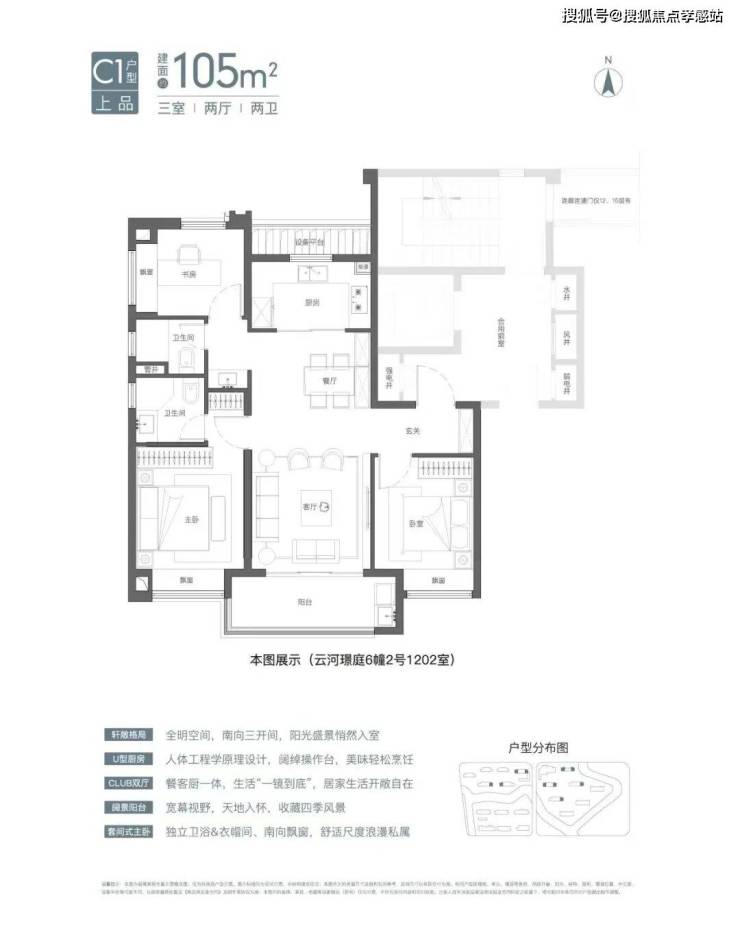 建面约105㎡3房2卫有宽厅和竖厅两种风格,其中宽厅户型好评度颇高。