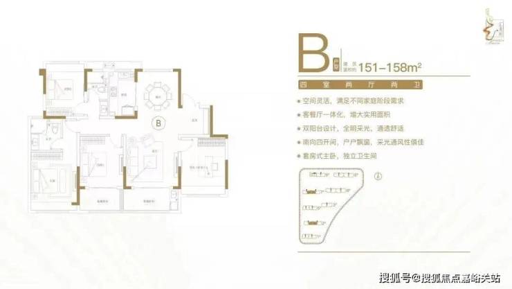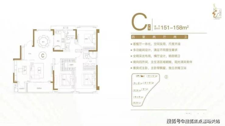 建面约151-158㎡四室两厅两卫户型特点:客餐厅一体化,空间实用,尺度开阔;多功能间设计,满足不同居住需求;全明采光布局,横厅设计,明厨明卫;南向四开间,主生活区域朝南,阳光清风常伴;套房式主卧,主卧带飘窗,独立衣帽卫。