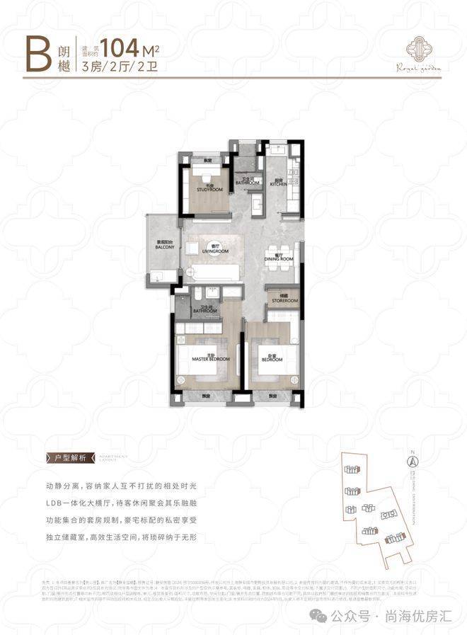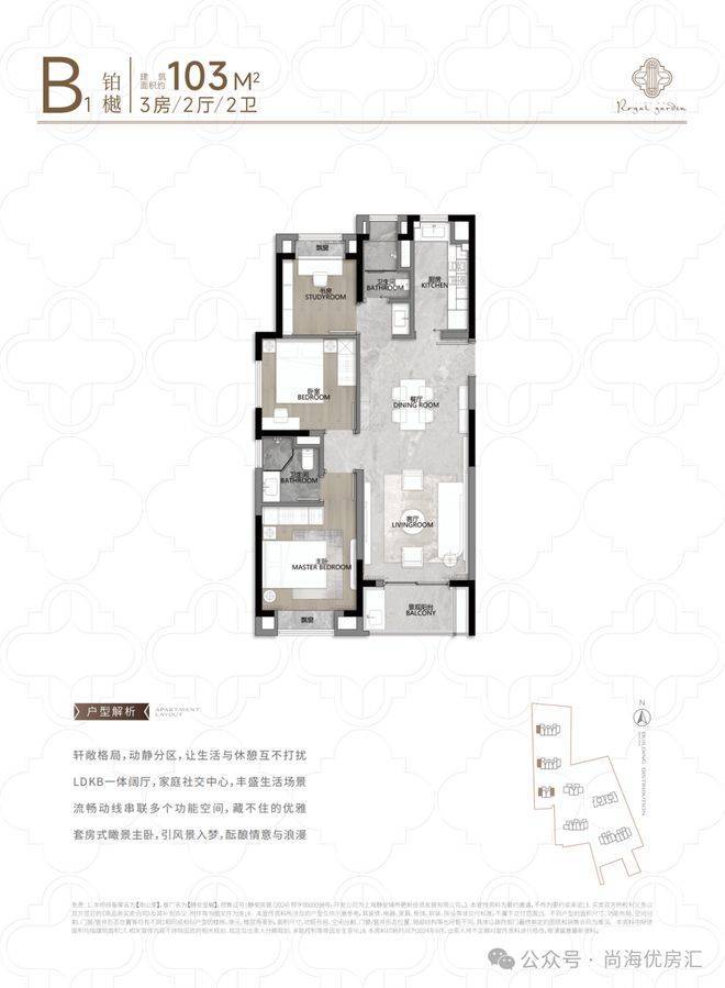 适合三口之家或年轻家庭居住的动静分区户型,厨房、餐厅、客厅及阳台一体化设计,动静完全分区设计,相当人性化!主卧套房设计满满尊崇感;次卫三分离干湿分区设计,考量十分贴心!