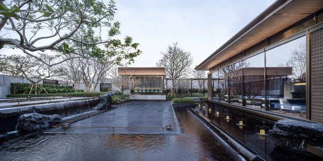 打造长约200米、近1000㎡水系景观,贯穿入口、庭院、归家轴线和景观主轴,采用五重造水形态,可行、可望、可游、可居,正是中式园林所追求的空间意境。