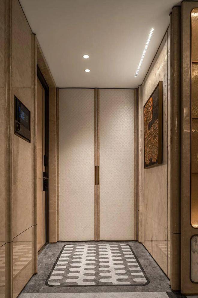 采用类一梯一户设计,电梯门开,迎面便是私家前厅。这片过渡空间,不仅是玄关的延伸,更是一道情绪的过滤器——它将电梯厅里的偶遇寒暄、城市的嘈杂纷扰,轻轻挡在门外。当您转身关上电梯门的那一刻,便完成了从“社会人”到“居家者”的身份切换。