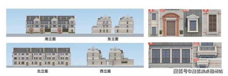 新组团立面采用大面青砖、局部红砖腰线与仿木铝合金门窗的立面做法,山墙以巴洛克观音兜为原型,顶部用平顶山花装饰,圆形石材窗套气窗装饰;屋面承袭传统小青瓦工艺,更新老虎窗。