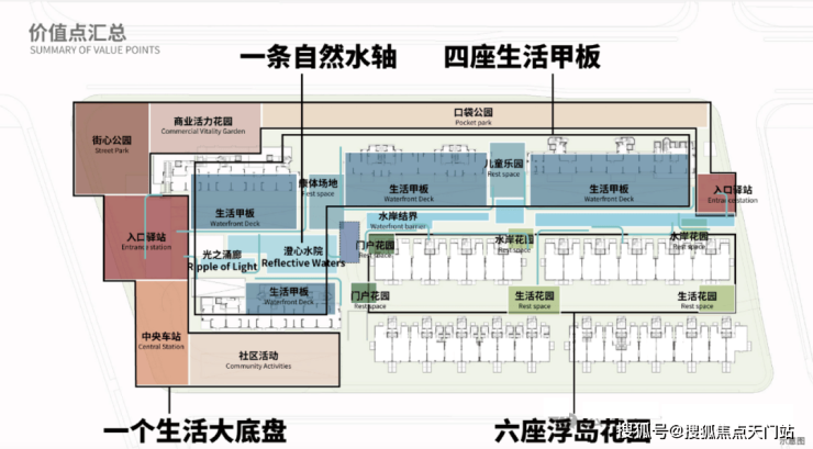 以自然水系为界,生长为独立的城市岛屿,通过六大景观节点,浮水之门、光之通廊、澄心水院、岸野森活、溪语花境、林语归岸,具象生活本应如流水般自在从容。