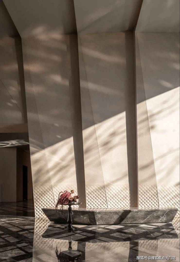 会所 墙面采用菱形钻石切面,是翡雲悦府设计团队,专门开矿甄选,2万平方内只挑选最好的1/10版面,以3倍石材厚度,进行雕刻。