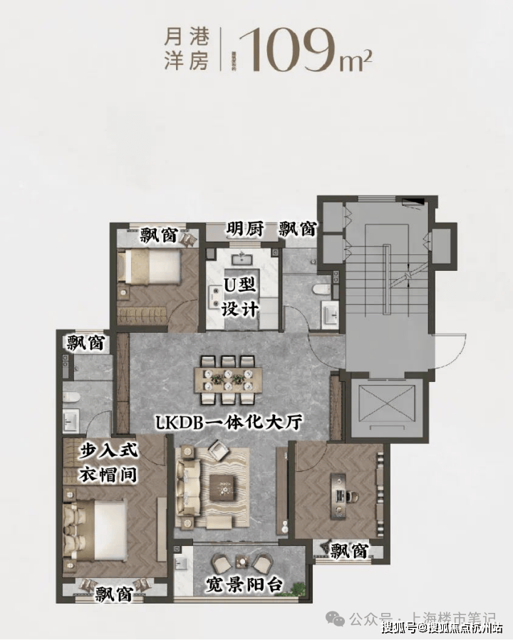 建面约109㎡墅区洋房:一梯两户、三开间朝南的“飞机户型”,做到了5个飘窗+1个阳台的极致拓展,尺度感和舒适度远超同价位竞品。