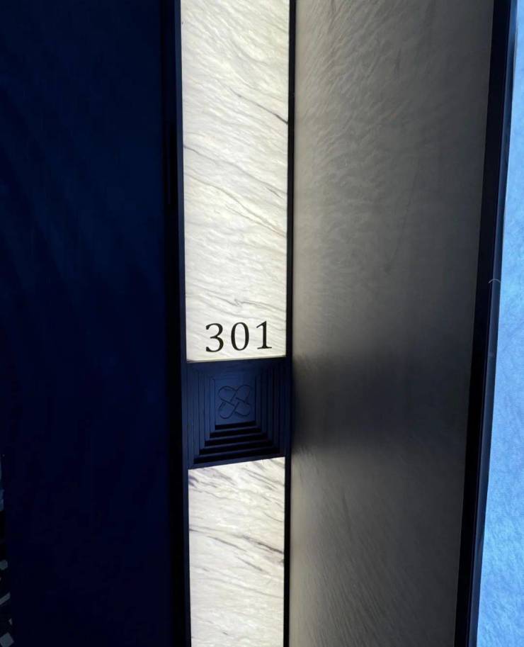 西派海上在入户门旁做了一个通顶的透光奢石,配上室号和项目独有的logo。