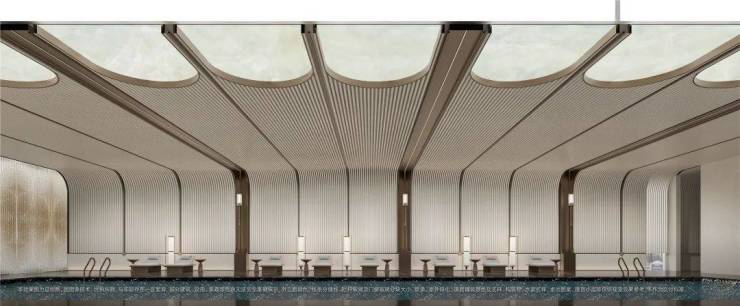 25x8 半标无边界泳池,池底运用了繁花马赛克,墙面与地面均使用大理石,天花板则运用发光玉石与造型艺术板,背景墙为LV同款定制双C造型艺术板,让这个泳池更平添一份艺术氛围。