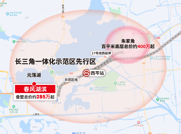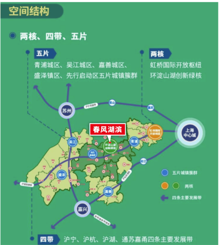 而春风湖滨则位于“长三角生态绿色一体化发展示范区先行启动区”。