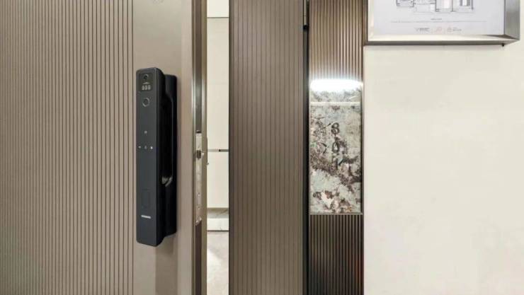 尚未入户,自带猫眼的四合一智能门锁,配合定制的门牌号与logo集合而成的入户门,彰显着主人的品位与尊贵地位。