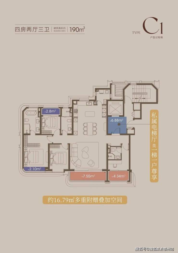 同时,这个户型拥有一个好户型应该有的所有特质:一梯一户、三阳台、主卧豪华套房、中西双厨...妥妥的终极改善产品。