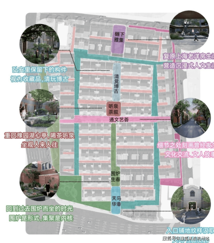 在社区的中轴上,弘安里植入记忆的符号与生活的画面,从入口处「天马华章」迈步前行,「围炉生春」「通文艺荟」「听泉茶叙」「清赏博古」贯穿到此次实景开放的「樾下雅集」,海派生活画卷昨日重现。