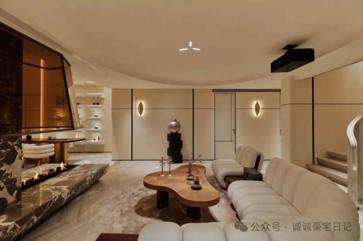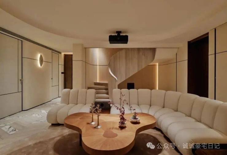 顺着弧形木质楼梯抵达地下空间,仿佛游走在一曲流动的乐章中。一切都共同呼应着水的特质,传递着低调隐逸情怀与圆融个性。