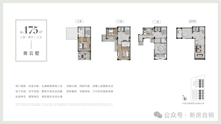 围合式合院,独立入户,三重院落有天有地有花园,人车分流,高窗墙比,窗窗见景,采光通风性佳