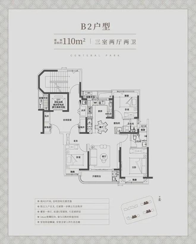 建面约110㎡中间套(B2户型)✅✅中环铂樾售楼处电话:400-8787-740✅✅,也同样做到了南北通透,三开间朝南,洄游动线,布局合理,无论是空间尺度还是通风采光,与边套享受一样的品质感!
