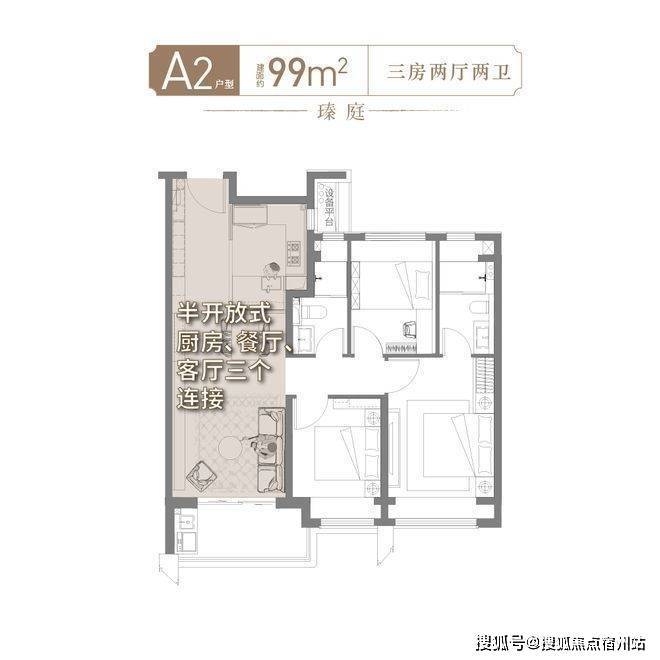99㎡的户型,三个房间都可以做卧室,无论二胎或三代同堂皆可。