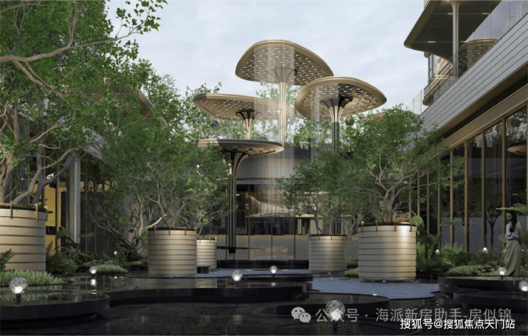 浮岛美学园林,归家即度假:以“浮岛”为核心理念,通过“林岛漫步—循水归岸—闲庭雅致”的动线设计,构建起层层递进的归家仪式感。园林内部“叠水—镜面—汀步”的立体水网,与外部公园水系相互呼应;连廊串联起架空层与景观节点,让自然与生活实现无界交融。