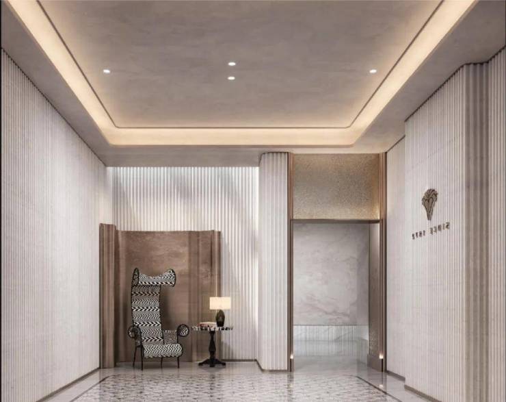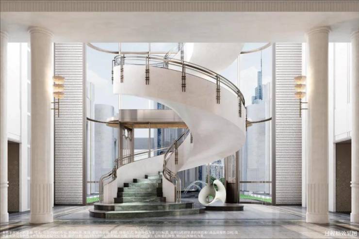 再仔细看细节,顶部香槟金色格栅塔冠以及壁柱采用香槟金和白色色调,将海派与现代之美生动演绎。