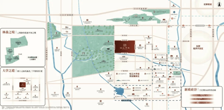 地块所在的广富林板块,本身的生态资源非常优秀,项目西侧一路之隔就是广富林文化遗址、广富林郊野公园、直线距离约1km+是辰山植物园,北面直线距离约3km是佘山国家森林公园、月湖雕塑公园等。