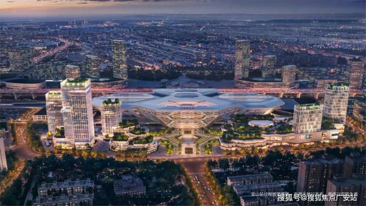 高铁宝山站枢纽总建筑面积约48万平方米。其中,站前广场建筑面积约39万平方米,含酒店、办公、商业综合服务等业态。