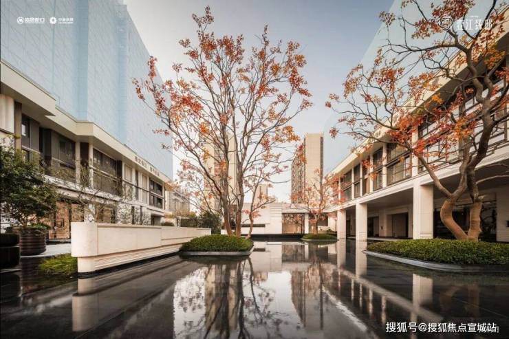 超千方镜面主题水院,时刻演绎自然与建筑的无界之美:澄澈镜面水面倒映建筑肌理与天光云影,搭配三株原生丛生乌桕的点缀,与回廊、浮岛相映成趣,营造出静谧雅致的亲水意境,这种沉浸式水景体验生活,在张江高端住区中尤为稀缺。